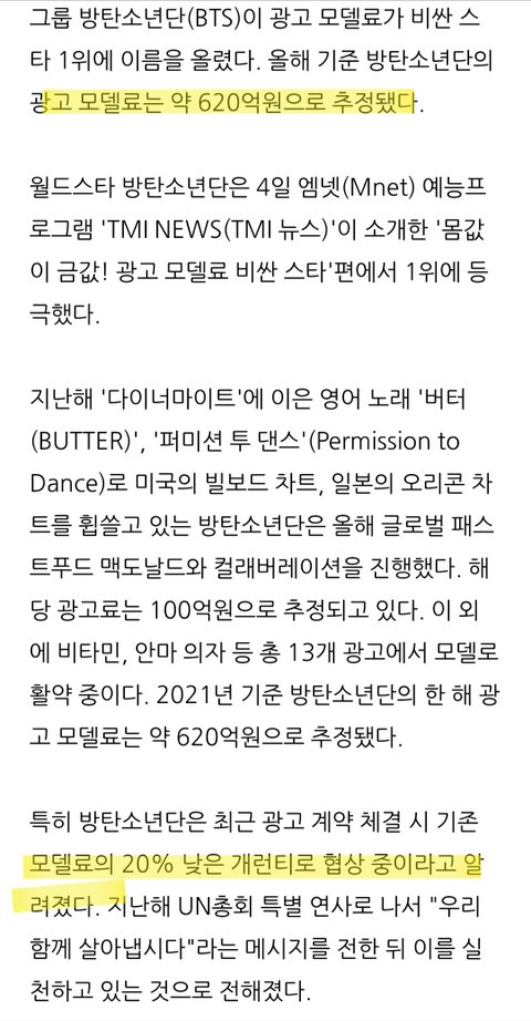 (방탄 광고료는 한국 연예계 역사상 조카 비싼 수치라고 나옴 +코로나때문에 게런티 20프로 낮춰줬는데도 620억임 삼성,현대 등 우리나라 최고 기업들 글로벌 광고모델)