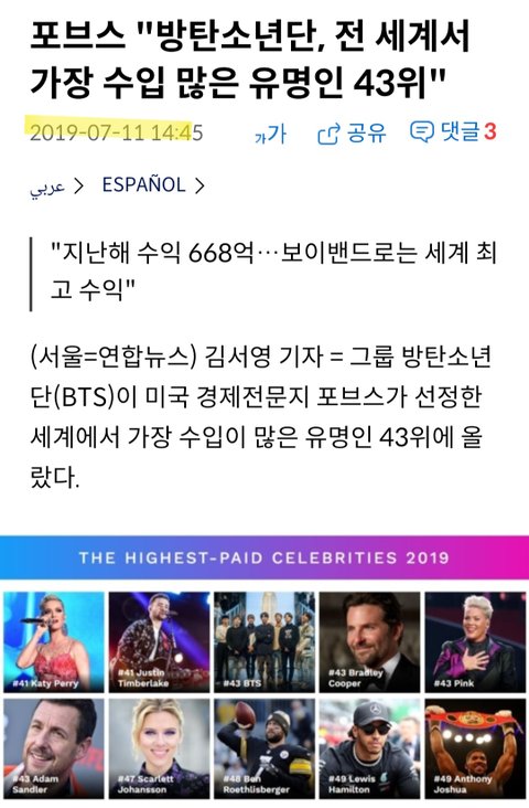 2019년 포브스 선정 전세계에서 수입 많은 유명인 43위