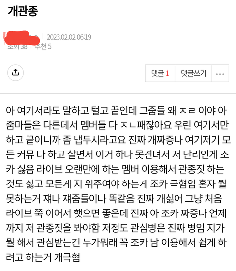 저기 엔터 글들이야? 서치해도 안나와서.. 패고싶은데 정국이팬코아니야? 정작 정국이 정상팬들은 합동라방도보고 그뒤에 위버스라이브도 거의 아침까지해서 아무 불만없는데 쟤네 누구야
