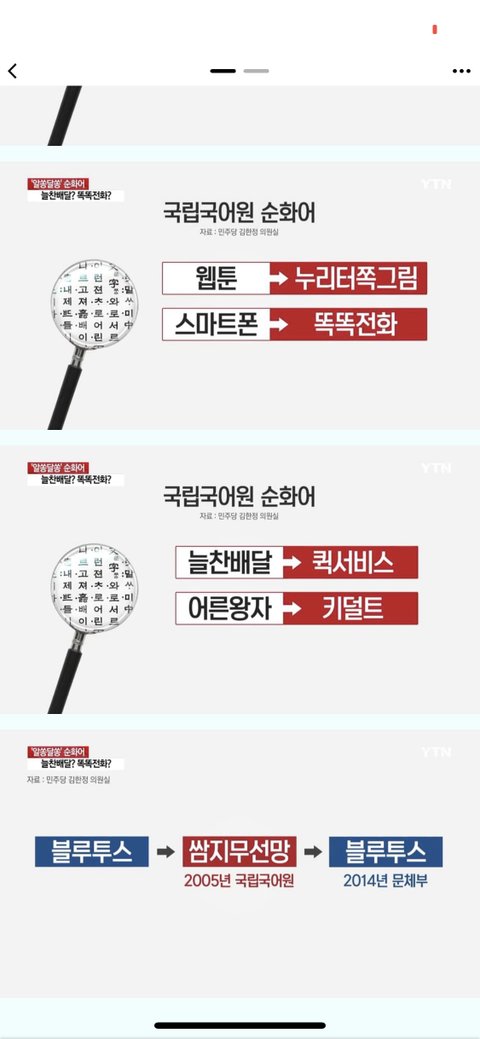 근데 걍 궁금한건데 왜 저런 우리말 순화어를 써야해? 우리말이 없어질까봐?? 확실히 요즘 외래어를 많이 쓰긴 하지만 그래도 아직까진 우리말을 훨씬 더 많이 쓰는거 같은데... 일본도 보니까 축구는 걍 싸카 라 하고 화장실은 걍 토이레라고 하던데 막 일본인들이 일본어가 없어질까봐 걱정하고 그러진 않잖아 아니야..??
