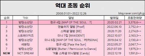 1.2.3위 다 방탄이고 4위 투바투로 역대 초동 4위임