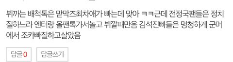 갤에서 까질하는게 성에안차서 판에와서 까질도 모자르고 베플조작도하는 미친줌들이 지민줌들 왜 정국석진빠는척하면서 이러고다님?느그 지민이나 빠시라고요 조카 어이없네 뷔까려고 파놓고 지민줌들 타멤머리채나 그만잡아