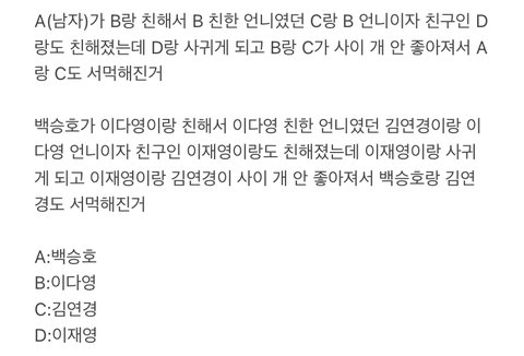 A(남자)가 B랑 친해서 B 친한 언니였던 C랑 B 언니이자 친구인 D랑도 친해졌는데 D랑 사귀게 되고 B랑 C가 사이 개 안 좋아져서 A랑 C도 서먹해진거 ㅇㅇ