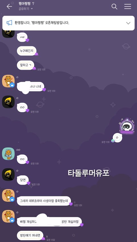 사생 뛰고 아이디 파헤치는 앰코가 어딨음? 누가봐도 정국악개임 ㅅㅂ 저런식으로 톡방 만든게 몇갠지 모름