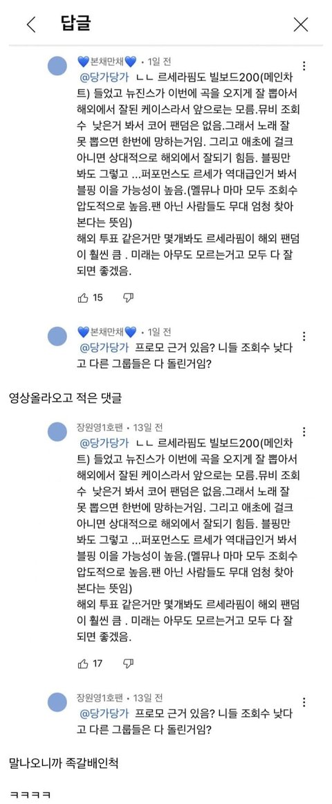 장원영 정병인지 방탄정병인지 개심하네ㅋㅋㅋㅋ 기존 베댓 반대 폭탄╋싹다 내리려고 까댓이나 망붕 댓들 추천 뭔 5분에 20개씩 조작하네 ..