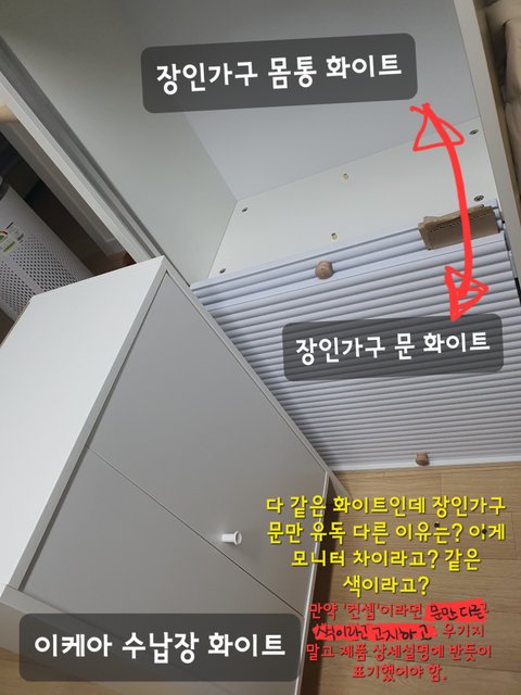 만약 저게 컨셉이라면 몸통은 아이보리 계열의 화이트고 문은 완전 백색이라고 당연히 표기해야 하는 거 아닌가요? 알고 사는 것과 모르고 사는 건 다르잖아요.