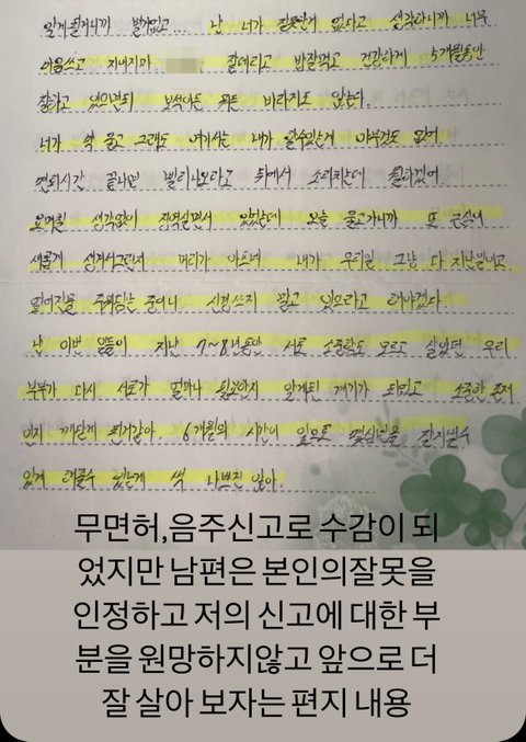 남편이 바람난 여자들과 만날 때 살인 행위나 다를 바 없는 무면허에 음주운전을 하고 다녀서 제가 여러 번 하지 말라고 설득했어요. 게다가 시댁에 남편의 음주운전 사실을 알렸는데도 시댁에서는 어떠한 조치나 대책을 마련하지도 않고 그저 방치했습니다. 남편이 계속 범법행위를 하길래 제가 작년에 신고해서 교도소에 들어가게 된 건 사실입니다. 그러나 제가 영치금을 사용하고 거래했다느니, 그런 사실은 전혀 없습니다.