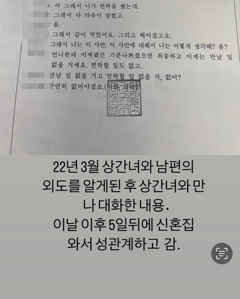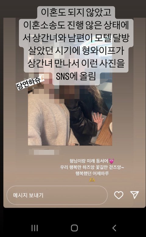 저는 남편의 첫 번째 외도 이후, 각자 갈 길을 가기로 하면서 집을 나간 적이 있었고 그때 잠시 친하게 지냈던 친구를 만나기는 했습니다. 그렇지만 마치 제가 먼저 외도를 하고 그 사실을 들켜서 집을 나간 것처럼 쓰인 내용은 완전히 허구입니다. 또 제가 남자랑 외국에 나갔다는 내용도 허위 사실이며, 형 와이프가 올린 사진들은 제가 집을 나갔던 당시에 제 친구들과 찍은 것입니다. 남사친, 여사친이든, 직업적으로 만나는 사람 등등 얼마든지 가능한 경우의 수가 많은데, 남자와 여자 둘이서 사진을 찍으면 무조건 연애를 하는 건가요? 상간녀와 남편은 뽀뽀 사진도 올리는데요.