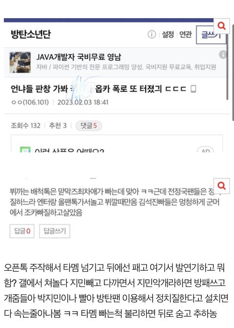 지들이 까짓 털릴까봐 맨날 진 정국 빠는척 뷔패고 뒤에숨어서 정국까질하고 오늘 오픈톡 주작해서 엔터에 글쓰고 악플 주작함 개쓰레기들
