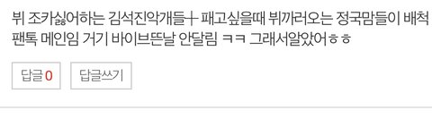 느그최애두고 발연기 방패 이용하지말고 누구보다 까질 미치신 지민악개들 오늘도 멤까 베플조작 잘해놓고 여기서 지들끼리 이용하는거 역겨워요