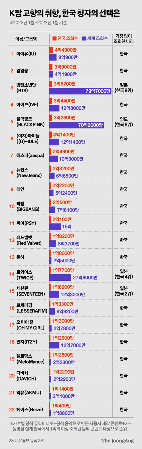 아이유 임영웅 방탄소년단 아이브 블랙핑크 아이들 에스파 뉴진스 태연 빅뱅 싸이 래드벨벳 윤하 트와이스 세븐틴 르세라핌 오마이걸 있지 멜로망스 다비치 악뮤 헤이즈