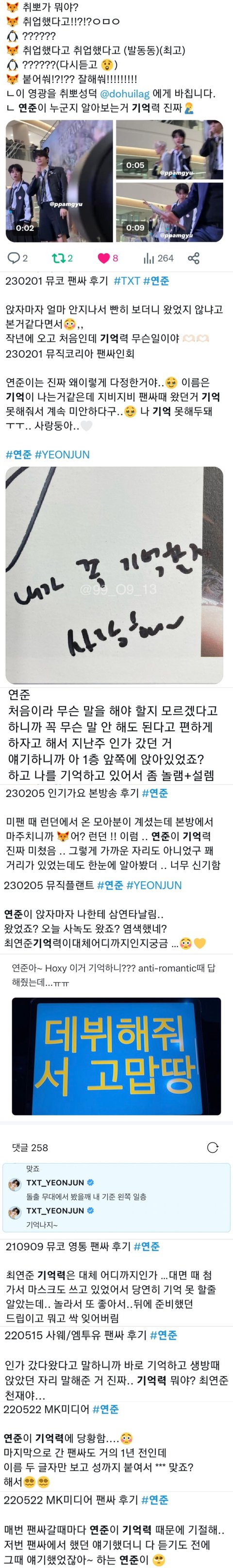 추반) 팬싸 간 모아들 후기 보면 연준이 진짜 한명 한명 다 기억하고 알아봐줌. 서치해서 제일 위에 뜬 것들만 추려서 이정도고 데뷔초부터 지금까지 쭉 그래왔음. 앞으로도 그럴거라고 확신함.