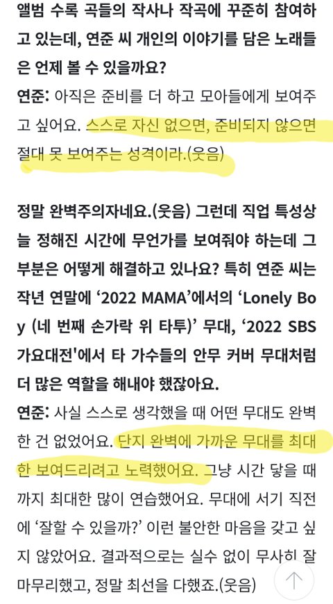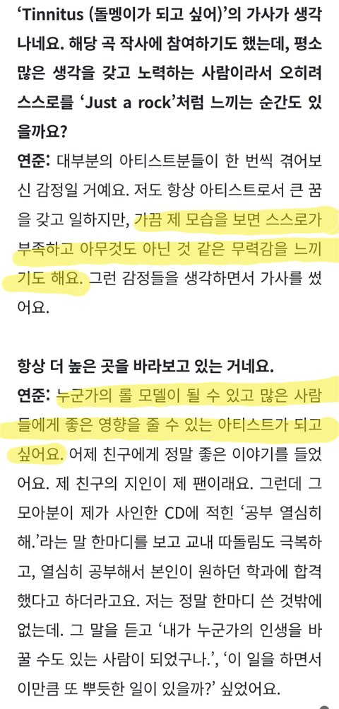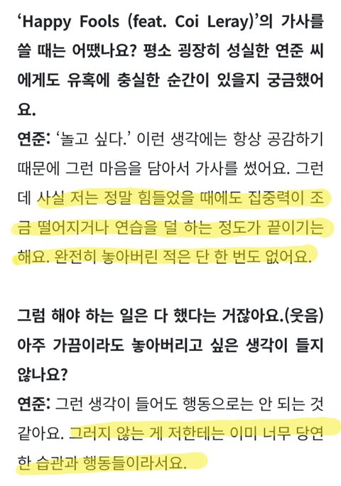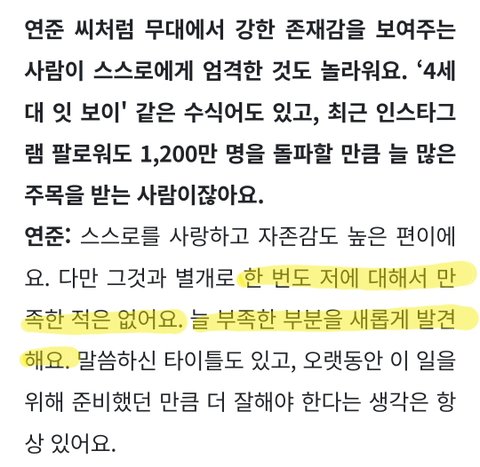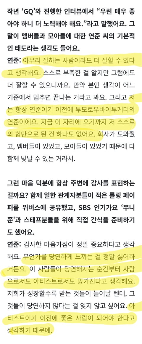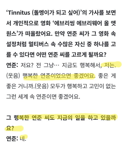 행복한 연준씨도 지금의 일을 하고 있을까요에 '네'로 끝나는 간결한 대답이 멋있다. 아이돌로 사는 삶이 쉽지만은 않을텐데 무엇이든 당연한 것은 없다고 생각한다는 그 마음가짐이 멋있어서 계속 응원하고 싶다.