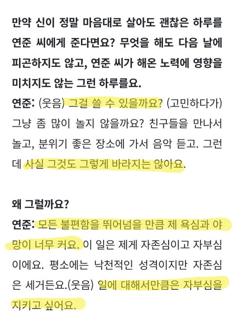 마음대로 살 수 있는 하루가 주어져도 쓸 수도 없을 것 같고 바라지도 않는다는 연준이