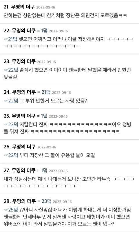 멤버들이 우정타투하면 뭐함? 멤버 까는데 이용하는데 ㅋㅋㅋㅋㅋㅋㅋ 방탄판 올팬 기조라는 소리 하면 죽이고 싶음