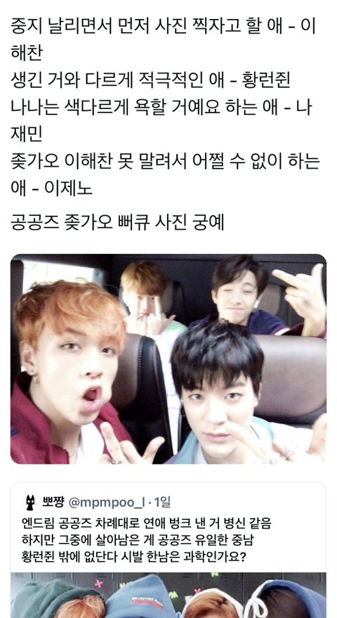 평소에 이동혁이랑 같이 장난 제일 많이 거는 게 제노(근데 맨날 이동혁만 말썽꾸러기 깐족대는 캐해인 게 의아)
