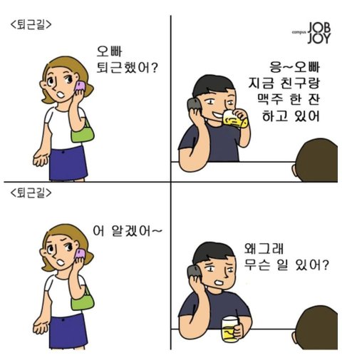 1.퇴근했는데 퇴근했다고 연락안함 2.거기다 말안하고 친구랑 맥주마심 3.지가 뭘 잘못한지 모름 나머지는 모르겠다 ㅅㅂ