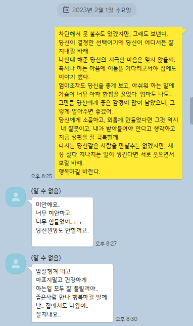 2월 3일 며칠동안의 감정을 추스리고, 통화를 요청했습니다. 오후 6시쯤 통화되면 전화달라고 했는데, 그녀는 2월 4일 새벽 6시 53분에 잠이 들어서 깜빡했다며 톡이 왔습니다. 그래서 오전에 헤어지고 나서 처음으로 통화를 하게 되었습니다. 그녀는 외로웠고, 밥해주는 사람이 되었다는 생각이 들었고, 내게 해준것들에 대해서 후회없고, 과분하게 잘 지냈다며 이별을 확인해주었습니다.