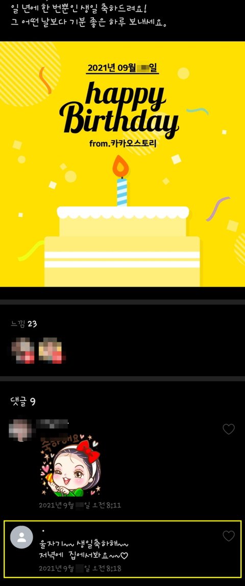 현재 배우자로 되어 있는 사람의 연락처를 받아서 카스를 보니 아직도 그녀의 이니셜과 하트가 있더군요. 지금은 사라졌지만, 저 남자와 만났을즈음에 그녀가 남편에게 남긴 카스 댓글들은 애정이 넘쳤었는데...