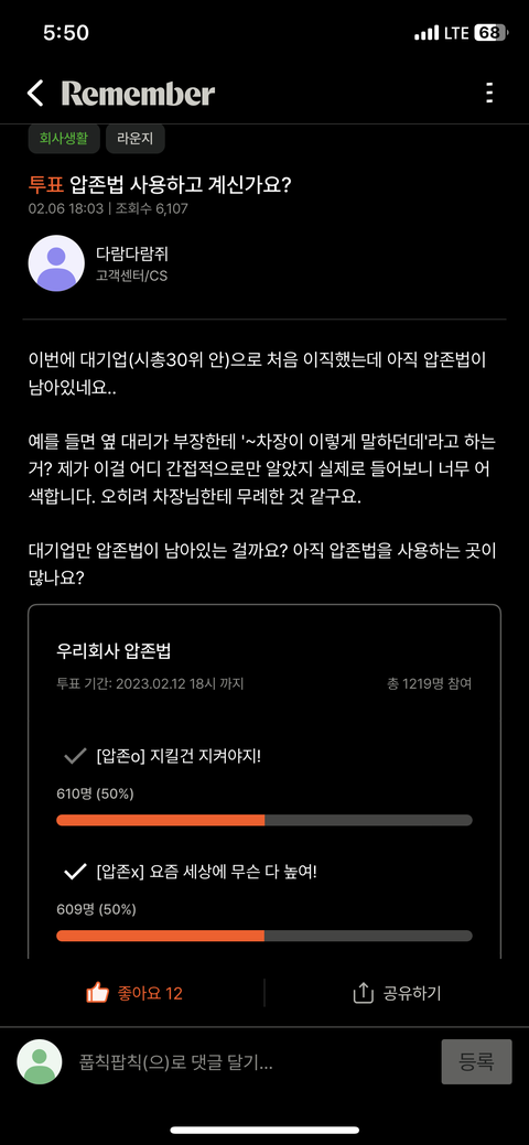압존법은 요즘 대기업에서도 지양한다고 들었는데, 투표 결과가 50:50으로 갈린다니 ㅋㅋㅋ; 다들 압존법 아직 쓰세요?