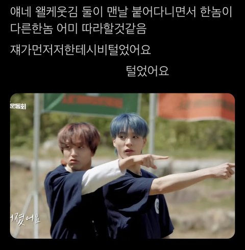 해찬이랑 제노ㅋㅋㅋㅋ 동혁이 옆에 잇으면 얌전~해 보여서 그렇지 초딩같은 결은 함께 하는 것 같음ㅋㅋㅋㅋㅋㅋㅋ은근 둘이 죽이 잘 맞는게 아 귀여워..