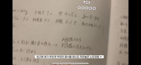 유인한테 맛있는 거 만들어주고 반응 보고 저렇게 별을 매긴 다음에 별 3이상인 것들만 노트에 레시피 적어놓음 .. 다음에 유인한테 또 해주려고 .. 와 진짜 매번 유니콘남이라고 느끼지만 이건 진짜 너무 감동일듯 ㅋㅋ ㅠㅠ