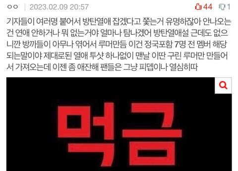 댓글 퍼옴) 정국 루머 쓰는 애들이랑 댓글에 또 다른멤 루머쓰는것들 팬들 아니고 다 똑같은 어그로 정병임 멤버들 가지고 1-2년째 같은 사람이랑 루머 뿌리는데 그게 진짜면 뭐 투샷이라도 가져오든가 매번 억지로 엮는거 아니면 없지ㅋ 관련글이랑 댓글 전부 피뎁따는중이고 대놓고 망한갤을 홍보하면서 가보라고하질않나 요즘 조용하다 싶으니깐 서로 싸우라고 부추기면서 루머 뿌리고 역바이럴 붙어서 관리질하는거 백퍼야 다른말 보탤 필요없고 먹금해줘