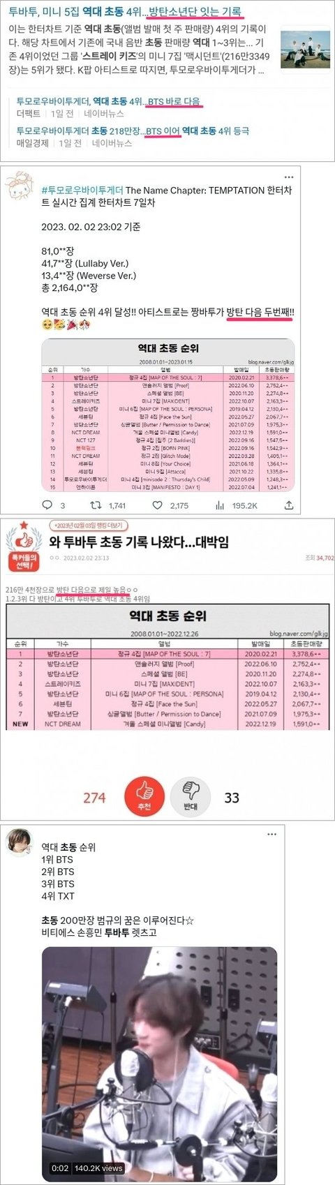 투바투 초동 4위 되고 자체 커리어하이 기록보다 <방탄 다음>에 포커스 두고 언플하고 영업해서 정리해봤어