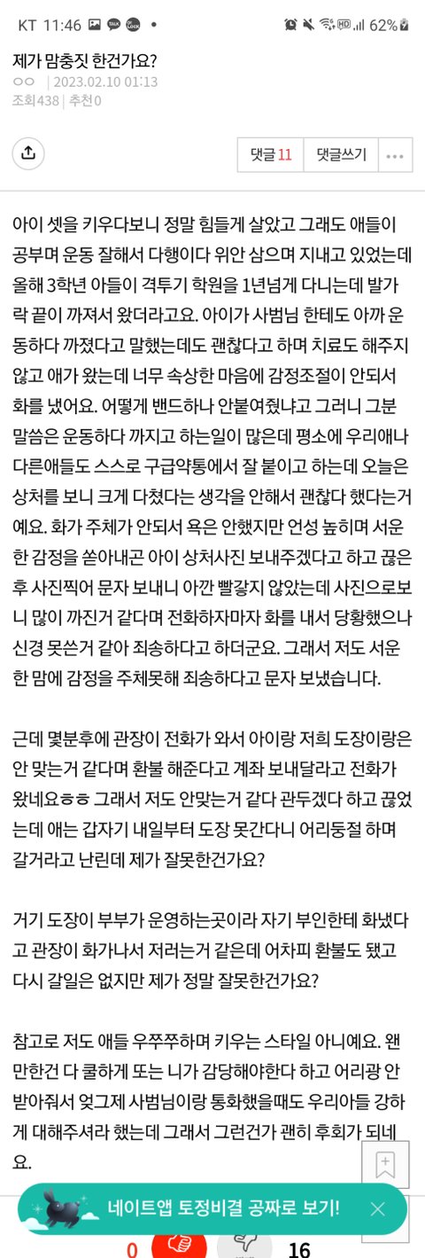 격투기 체육관 다니다보면 까지거나 쓸리는 건 종종 있는 일인데.. 눈에 넣어도 안아플 자식이지만 너무 감정적으로 과잉대응하신 건 아닌가 싶네요. 제3자 눈에야 자식사랑이 유별나다 정도로 말지만 관장부부 입장에선 피곤한 유형이니 환불해주고 상종하지 말자 할만해보여요. 아이 입장에서 생각해보면 잘 다니던 도장인데 별 것도 아닌 걸로 엄마 때문에 갑자기 못 가게 된건데 원망이 크겠어요. 잘 위로해주세요.