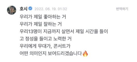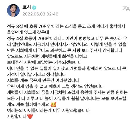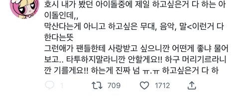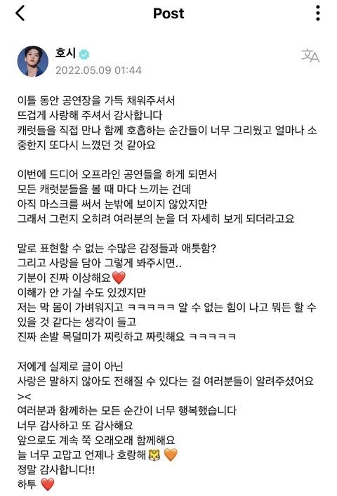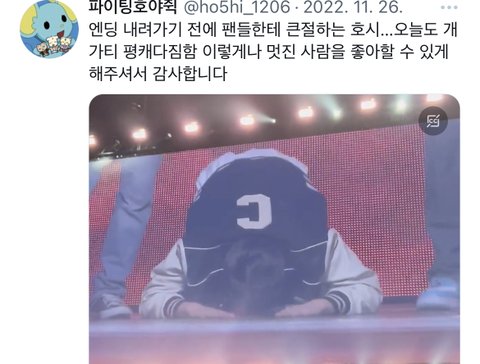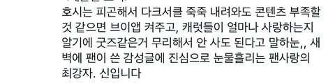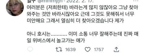스껄하게 저희집 호랑이 영업 한번만 하고 가겟음 .. 호시.. 본업 잘하는건 말해뭐핸데 진짜..진짜.. 조카게.. 열심히함 ..구년찬데도 쉬는게 불안해서 작년에 일년동안 솔로,유닛, 단체 합쳐서 5컴백하심 ㅋ + 아직까지도 더 높이 올라가서 최고가 되고싶다는말 입에 달고 살만큼 독기가 그득함ㅇㅇ .. 근데 여기서 더 사기캐인건 돌판 레전드 소통킹임 .. 인스타는 당연하고 위버스 "365일 출석" ( ㄹㅇ 하루라도 위버스 구독해보면 알거임.. 나 매일 얘 위버스 알림으로 일어나잖아.. ) + 매번 3-40개씩 답멘 + 위라도 자주옴 .. // 슈취타에선 낯가려서 조용조용햇는데 무대 욕심빼고는 자존심, 승부욕 1도 없는 상호랑이 쾌남 성격이라 매번 뭐든 팬들이 궁금해할만한건 스껄하게 스포해줌 ( 덕분에 라이브중에 회사에서 카톡이 자주 오긴하지만요) + 팬들한테 하도 티엠아 남발해서 팬덤내에서 "..?별걸 다 알려주는 호랑이.. " 로 통함.. ( 당연함 병원갓다가 처방내역 약봉투 사진까지 공유해줌, 본인 노담인거 알려줌, 혈육누나 쌍수한것도 말해줌 ) 유료소통창구도 따로 없는데 그냥 형식적 소통이 아니라 자기가 알려주고 싶은거, 하고싶은말이 잇어서 매일 위버스 찾아오는게 리얼 기특하고 신기함 .. 나 이런 아이돌 첨봄 ㅠ