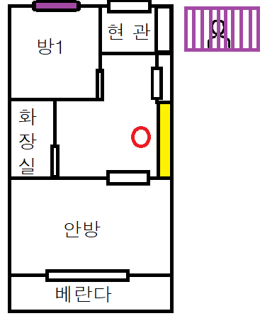 새벽 시간에 배고파서 뭐라도 먹으려고 부엌(노란색 부분)에 있다가 뒤에서 이상한 느낌이 들어서 돌아보니