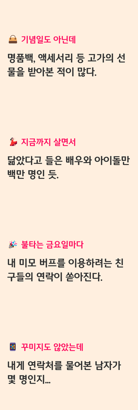 1. 금요일마다 친구들이 압구정이나 강남 같이 가자고 연락옴2. 장소 상관없이 번따 많이 당함