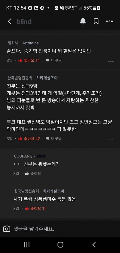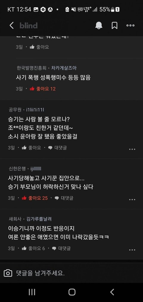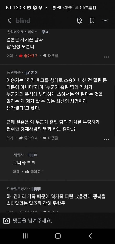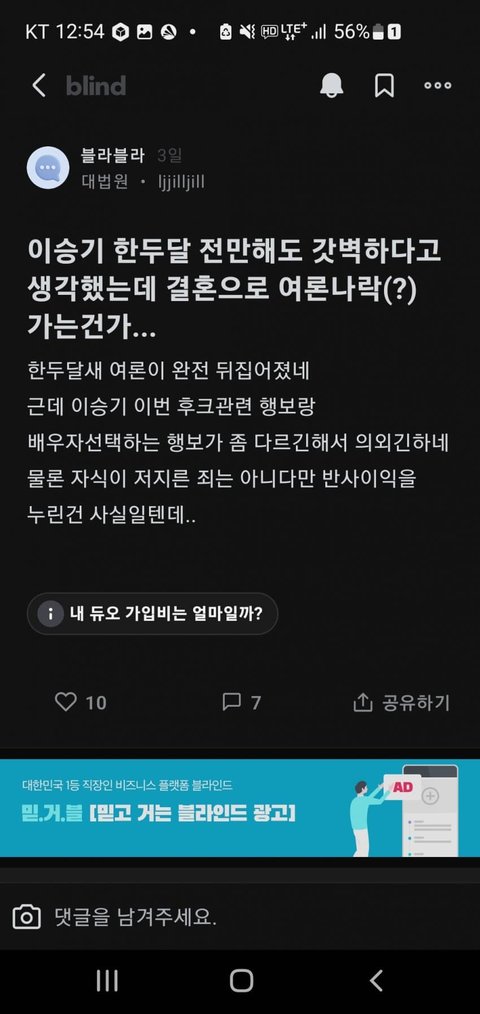 이승기 결혼 블라인드 반응