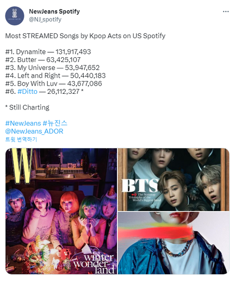 남그룹 + 걸그룹 통합일경우 1~5위가 방탄 노래, 6위가 뉴진스 Ditto