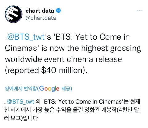 방탄 공연 영화 Yet to Come 어제까지 수익