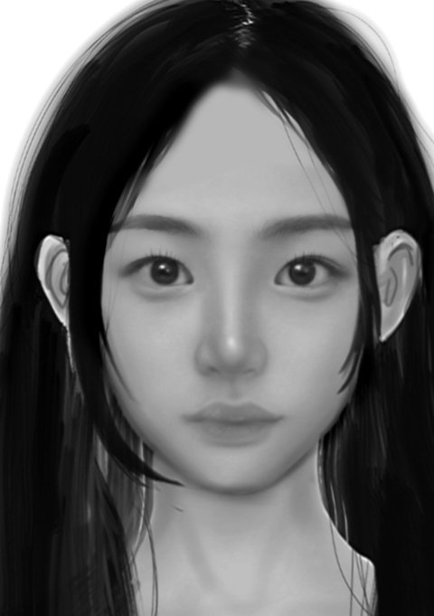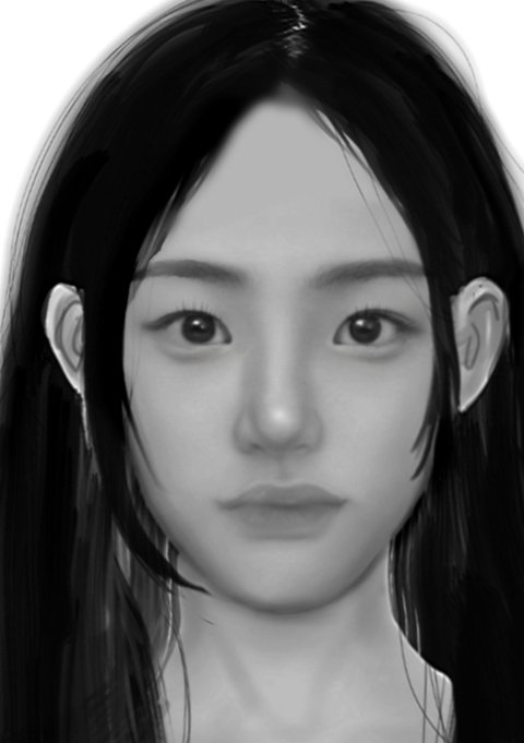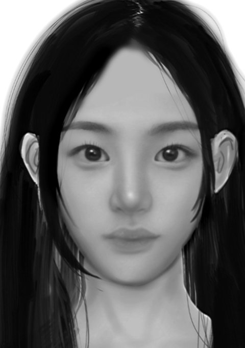 눈크기 줄이고 얼굴 볼부분 늘려야함 입술 두껍게 수정하고 콧대도 두껍게 만들어야함(콧볼을 콧등보다 좀 더 두껍게) 사진기준으로 왼쪽눈썹 좀더 일자로 만들기╋왼쪽눈꼬리살짝 올라가게 만듦 사진기준 오른쪽 입꼬리가 더 올라감