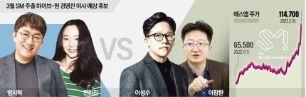 하이브는 SM엔터 이사 후보로 ‘빅샷’을 내세울 것으로 관측된다. 방탄소년단(BTS)을 키운 방시혁 하이브 이사회 의장과 걸그룹 뉴진스를 글로벌 아티스트로 키워낸 민희진 어도어 대표이사 등이 후보로 꼽힌다. 경영권 향방은 주주들의 표심에 달렸다. 표대결을 앞두고 SM엔터 주가도 요동칠 전망이다.