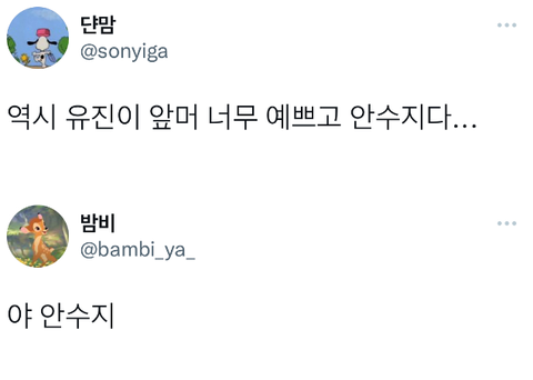 카즈하 말고도 안유진 팬도 안수지라고 하는거 내가 수지팬 아니라도 기분 나쁜데 아기수지에 이어서 이게 뭐야 짹에 수지 서치하다가 이런 트윗만 많으면 좀