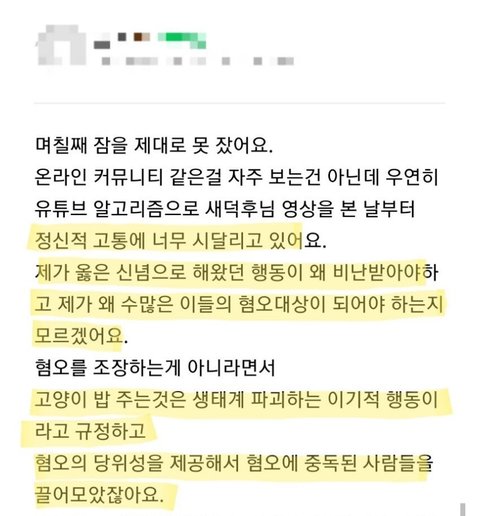 저는 새덕후님의 영상을 알고리즘을 통해 우연히 접한 이후로 끔찍한 정신적 고통에 시달리고 있습니다.영상을 시청한 수많은 사람들이 길고양이 밥을 주는 일은 나쁜 일이라 규정짓고제가 신념을 가지고 행했던 일들을 비난하고 혐오의 시선으로 바라보고 있었습니다. 하루 아침에 온갖 혐오의 대상이 된 저는 현재 자살방지상담과 정신과치료를 받고 있으며이 일을 지속하는것에 어려움을 겪을 정도로 고통받고 있습니다. (사람들의 시선이 두렵습니다)