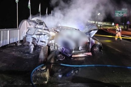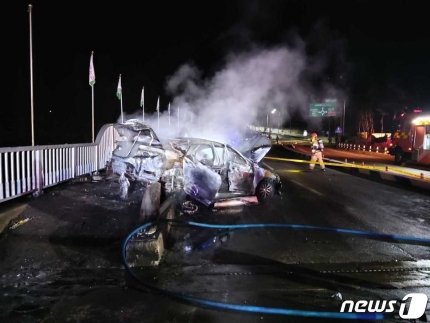 경찰과 소방 당국에 따르면 사고는 전날 오전 1시23분쯤 평창군 대관령면 용산리 회전교차로 인근 교량에서 발생했다. 그랜저 차량이 가드레일을 들이받은 뒤 화재가 발생했다. 목격자들로부터 “차에 불이 붙었다”는 신고를 받고 출동한 소방대원들은 20여분 만에 진화했다.