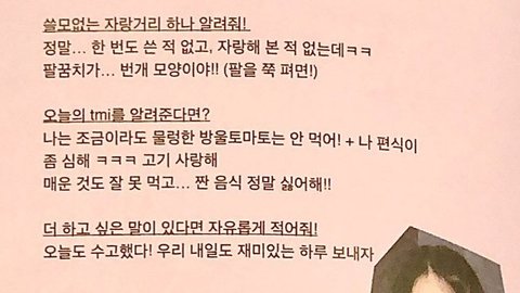 민지 애초에 매운 것도 못 먹고 짠 음식도 싫어한다니까 안 먹었다 하면 그런가보다 해~ 컨셉이다 유학파인 척 한다 뭐다 하지 말구...포닝에선 팬들이 물어봐서 답 해준 것 뿐인데 괜히 욕 먹네 ㅠㅠ