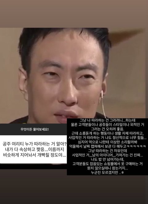 내로남불이야 일반인은 따라입어도되고 옷은 똑같이 만들면안된다? 자기도 수입의류입고 명품 전부다 디자인 카피해서 내려오고 고치고 하는건데ㅋㅋㅋ 말도안돼 자차제작하는거마냥 다른 사람들이 파는 수입옷,구두 신고 자기도 이렇게 만들거라는식으로 얘기했는데?