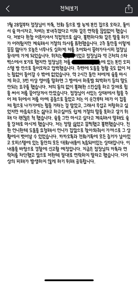 안녕 너무 화가 나서 반말로 말해도 이해해줘 좀 더 이해하기 쉽게 할 려고 쓸께 :)나는 얼마 전까지 아니지 불과 3일전만 해도 대기업 프렌차이즈 xxx 피자집에서 일하고 있었어 처음에 점장이란 사람에 대해 악 감정도 없었고 그냥 일하고 있었는데 어느 날 점장이 자기와의 약속을 들어달라며 꼭 들어줘야 한다고 했고 그래서 나는 평소처럼 심부름 시키려나보다 하고 알겠다고 했어 그런데 그걸 빌미로 밤늦게 술을먹자며 자기 집으로 넘어와라 택시 비 주겠다 하루만 술친구 하자 그러며 갠 톡 이 왔고 나는 그래도 점장이니 불편해서 돌려 돌려서 거절하고 못 간다 얘기하고 안 가고 있었어 그랬더니 자기의 부탁을 들어주기로 하지 않았냐며 와달라고 오라고 계속 불렀고 나중에는 오빠라고 해라 점장이라고 세번이상 부를시 외박을 해야 한다고 술을 먹자고 그랬고 계속 거절을 하고 있는 와중에 회식 날짜가 잡혔는데 내가 참여한다고 했더니 본인은 안간다고 본인이 회식을 아예 취소하고 그럼 할말이 있으니 집 앞 카페로 와 달라 대화 좀 하자 그래서 부모님께도 다 말씀드리고 얘기만 하고 오겠다 친한언니한테도 부탁해서 미리 다 얘기해놓고 갔었어 물론 여기서 간 나도 잘못이 있다고 생각한 사람 있을꺼야 근데 나는 점장이 너무 무서웠고 덩치도 엄청 커 그리고 나는 잘리는 줄 알았고 그래서 혹시나 하고 갔는데 갑자기 카페 윗층에 있는 본인집으로 끌고갔고 나는 앞에서 계속 이건 아니다 들어가는 건 아닌 것 같다 하고 실랑이를 하다가 결국에는 끌려서 들어가게 되었고 그냥 처음에는 앉아서 정말 일 얘기만 하고있었어 그러다가 내가 나온 대학을 물어보더니 자기는 그 대학사람들 너무 존경한다 자기는 공부를 못해서 고졸에다가 그때부터 이 일을 계속 해왔다고 하면서 자기를 한번만 안아달라고 너무 존경해서 그렇다고 계속 안아달라고 얘기하더니 결국엔 본인이 끌어안더니 내가 이건 아닌 것 같아서 뿌리칠려고 하니까 다리로 나를 못움직이게 하고 그러던와중 난 정말 이건 아닌 것 같아서 뿌리치고 친한언니에게 여기로 와달라 나 너무 무섭다 해서 언니가 점장 집 앞에서 소리를 들으면서 대기하다가 도저히 안되겠다 싶어서 언니가 초인종을 눌러서 들어왔고 언니는 바로 점장한테 소리치며 '어린애 한테 뭐 하는짓이냐 이게 맞는 거냐' 라고 했고 점장은 언니를 보자마자 죄송합니다 라며 고개를 숙였고 오해하신거다 라는 말도 안되는 말을 하더라 그래서 언니는 나를 바로 데리고 나와서 집으로갔고 점장이 카톡이와서 하는말이 미안하다 나는 그저 너의 떨어진 자존감을 회복시켜주려고 한 것이다 라고말했고 나는 거기서 할 말이 없어서 그만두겠다 연락하지마라는 카톡으로 끝을내고 알바생,직원들이 있는 단톡방에 모든 카톡캡쳐본과 그 날 내용을 올리고 나왔고 그 날 이후로 거기있는 여 알바생들은 현재 그만 둔 상태야 그럼에도 여전히 여 알바생을 구한다는 공고글이 올라오고있어 무조건 막았으면 좋겠어 이런 일 이 더이상 생기지 않기를 바라며 글을써...추가로 같이 일했던 여 알바생이 나 대신 알xxx에 알바썰로 이 내용으로 글을 썻더니 그 자체에서 삭제하고 글 이용제한을 걸었다고 하더라고 이것도 나는 말이 안된다고 생각해 이런일을 침묵시키는건 잠재적 범죄자를 키우는거에 불과하지 않을까??? 그리고 나는 이미 경찰서에 고소장을 작성한상태이고 조만간 본사에도 알릴생각이야 그래서 그 전에 이 글이 꼭 널리널리 알려지면 좋겠어 긴 글 읽어줘서 고맙고 꼭 처벌받게 빌어줘.대기업 프렌차이즈 xxx 강서 xx점 점장님 제발 정신차리세요.점장님이 그동안 나에게 했던 강요 카톡 첨부해서 올릴께