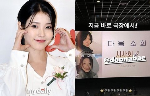 아이유는 14일 "지금 바로 극장에서! ★추천 추천 추천 추천★"이라며 영화관에서 찍은 사진을 공개했다.
