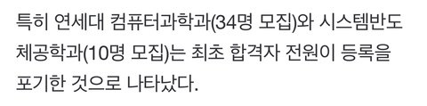 연대 시스템반도체공학과는 졸업하면 바로 삼성전자에서 일할 수 잇게 삼성이랑 계약 맺은 학과인데 이번 입시에서 최초합인 사람들 전체가 다 등록 포기했다고 함 개미쳣네 진짜