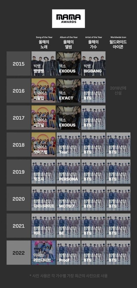 개소리 ㄴㄴ 차이 벌어지기 시작한건 17년이고 18년부턴 방탄 독주체제로 갔음. 특히 19년부터 최초로 모든 대상 싹쓸이하는 기록까지 세웠는데 이때 엑방이 비슷했다는건 도대체가 양심이 있는건지..