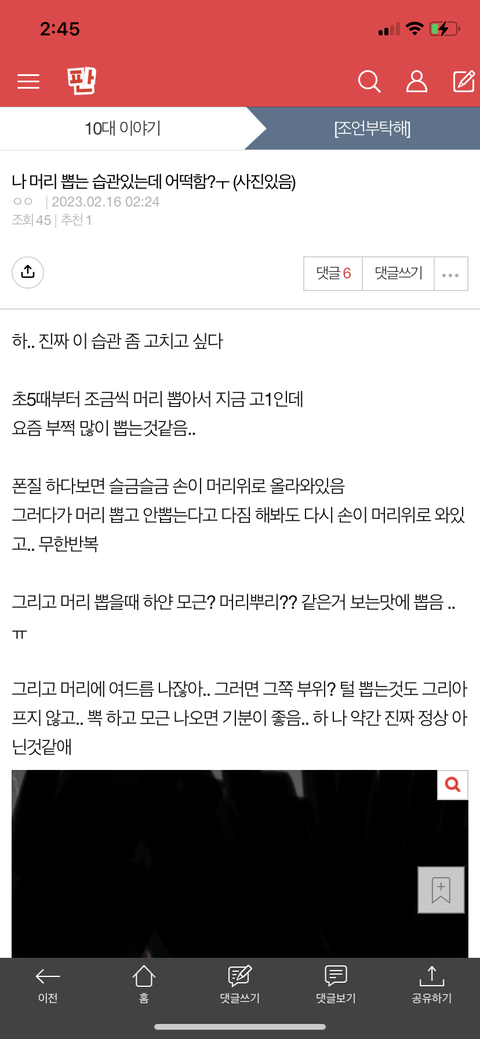 걍 엄마한테 말 해서 진짜 정신과나 피부과 갈라고.. 속상하다 나 자신..ㅆㅂ.. ㅠ 우울함 혹시 너희중에서도 머리 뻡는 습관 고친 판녀있디면 말해줘..