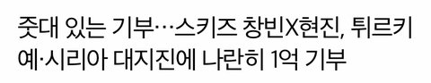 그룹 스트레이키즈 창빈, 현진이 튀르키예, 시리아 지진 피해 복구를 위해 나란히 1억원을 쾌척했다.