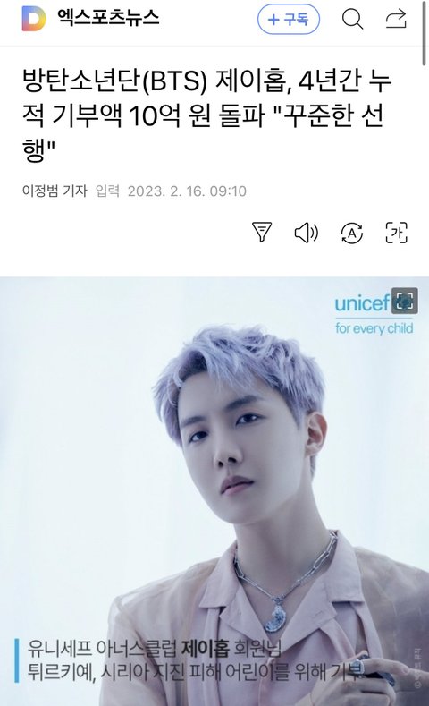 방탄 제이홉 4년동안 누적 기부액 10억이래