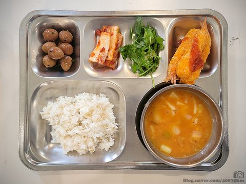 왕새우튀김, 잡곡밥, 김치수제비, 메추리알장조림, 사과참나물샐러드, 포기김치.